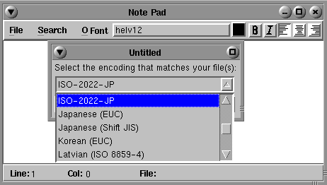 既存の日本語ファイルをエディタで開く場合にも、最初にそのファイルのエンコード方式を指定します。これを怠ると、デフォルトのエンコード方式と、開くファイルのエンコード方式が違う場合、文字化けが起こります。ファイルを開こうとして文字化けが起こった場合は、違うエンコードを指定してからもう一度ファイルを開いてみてください。 |