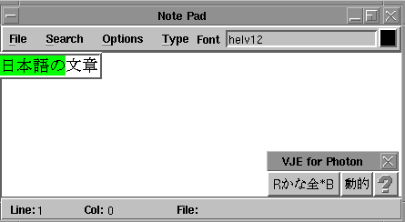Photon上で日本語のファイルを作成、操作するには、Photonエディタを使用します。 Photonエディタを起動するには、 pterm ウィンドウでコマンド ped を入力ます。